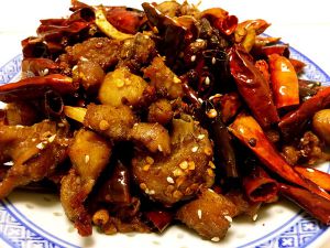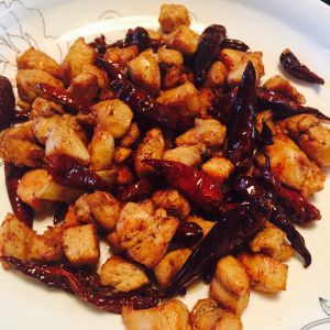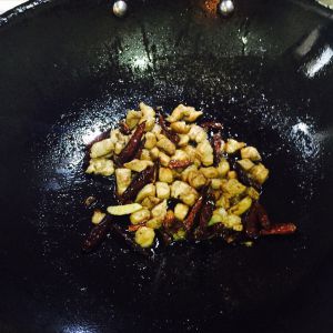 炸就完了。鸡肉炸好,所有食材放一起使劲翻炒,加麻油花椒油,出锅,干就完了!