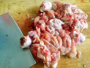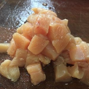把鸡腿剁碎 加入料酒 少许食盐 研制一下