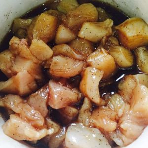 鸡肉切块,放盐,料酒,鸡精腌制,然后打鸡蛋,倒入吉士粉上浆。