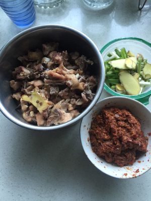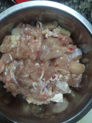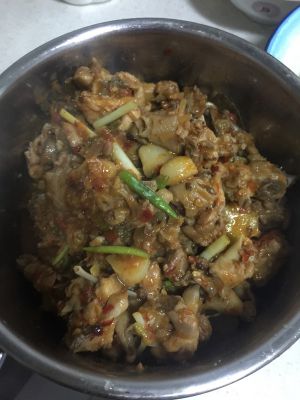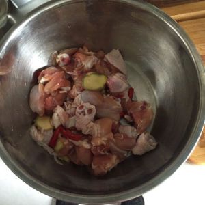 将鸡腿肉剁成小块。放小米椒姜,料酒,白酒腌制一下。