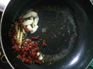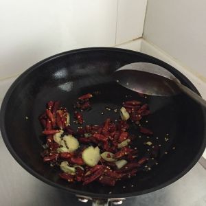 放入干辣椒 大葱段 花椒爆香