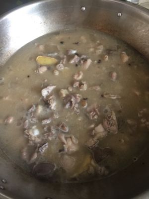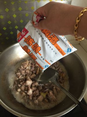 将菜油烧制7层热,放花椒和姜片把油爆香,将鸡倒入炒干些水份,再放一包黄酒焖煮