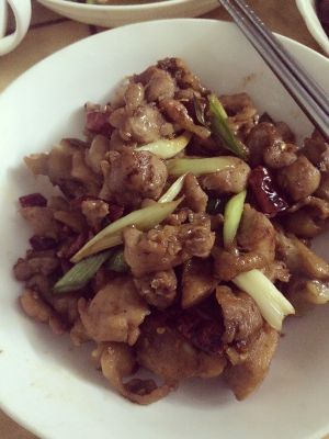 锅内留底油,将辣椒段,蒜头片,姜丝下去爆香,在加入炸好的鸡肉丁进行翻炒,加入适量的盐,酱油,最后加入孜然粉,蒜苗再翻炒几下即可装盘