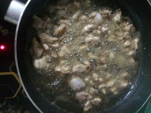 放入煸好的鸡块大火炒,最后放点酱油翻炒几下即可