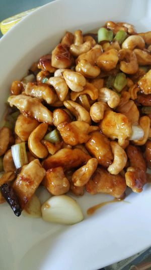 鸡肉锅中放入葱姜蒜粒。翻炒爆香。放入上面酱汁1分钟收汁。关火。倒入腰果拌匀装盘。
