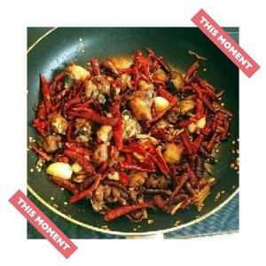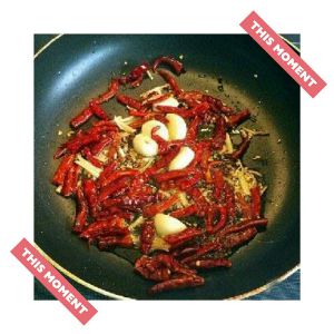 再起一锅加油,放入辣椒、蒜、花椒炒出香味。