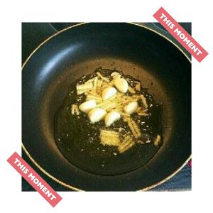 热锅冷油,用小火将蒜瓣和姜丝炒出香味。