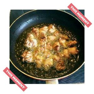 鸡皮略焦卷缩时,倒入腌好的鸡块