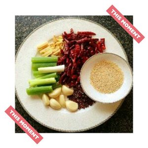 趁鸡丁腌制的过程中准备好配料,辣椒,花椒,五香叶,八角,白芝麻