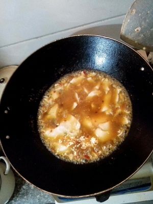 把豆腐放进去,轻轻拌匀。加入豆瓣酱,老干妈,小米椒再放点水,和豆腐一样高水位就好了,盖上盖子,焖3-5分钟