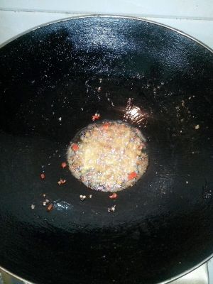 油锅里倒入调和油烧热,放入红椒粒,花椒粒,蒜粒,姜末,爆香