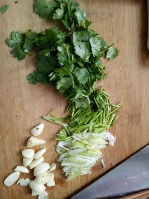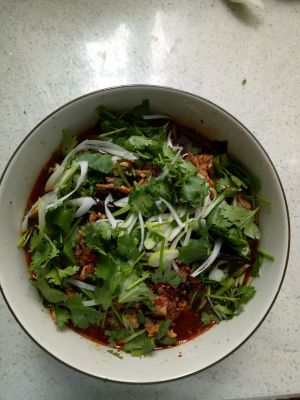 辣椒面,麻椒,撒在肉片上,炒锅烧热油淋在上面,撒上香菜葱丝,香辣的水煮肉片出锅了。