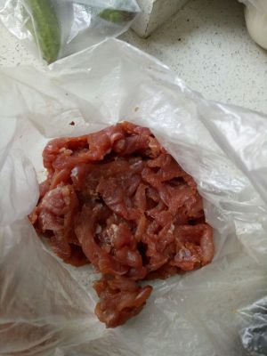 买来的猪前肘肉,稍微冷冻一下,这样切出的肉片儿薄薄的。切好的肉片儿加入少许料酒,盐,以及玉米淀粉抓匀,腌制30分钟以上