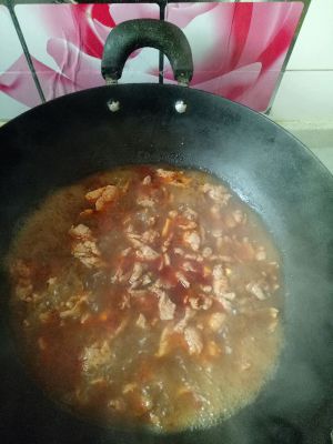 放入腌制好的肉片,等变色。 10克淀粉和10克水调和后倒入锅中勾芡。