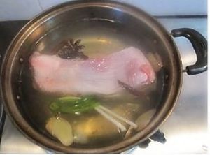 将桂皮、茴香、料酒加入锅里,加适量水,加少许盐。水热后,放入整块五花肉,7分钟左右将五花肉放入冰的凉水中;