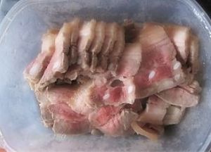 五花肉煮至六成熟(用筷子可以插进去),取出放冰箱,等其冷却,取出切片