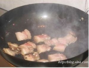 坐锅热油,放辣豆瓣酱,煸出红油,放切好的五花肉煸炒出油后盛出