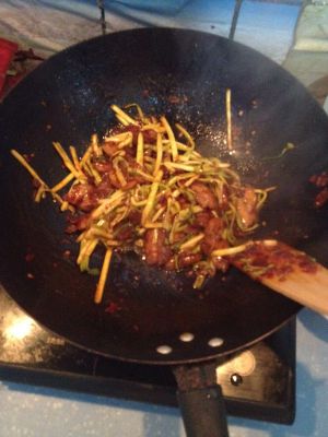 把肉切薄片,尽量薄一点这样好烧一点,,将锅烧热放油,烧至八成热放入姜煸出香味倒入切好的肉片炒至变色转小火慢慢将肉片里的油煎出来