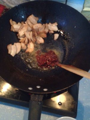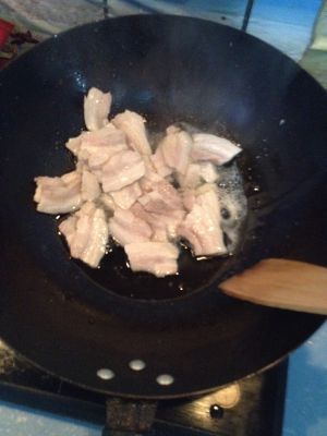 五花肉切薄片,下油锅翻炒,不要炒太久