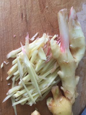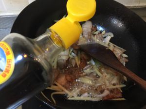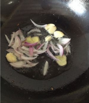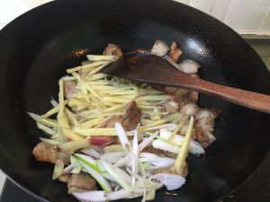 把肉放进去中火炒出油,然后放进姜,葱煸炒