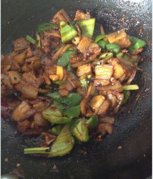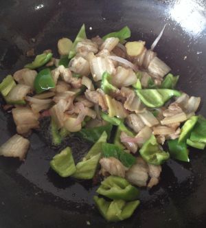 将五花肉片倒入,翻炒几下后放入青椒块翻炒。