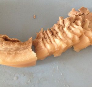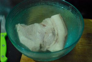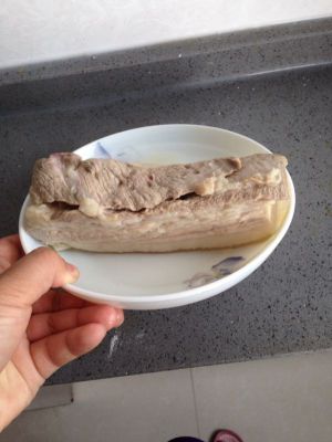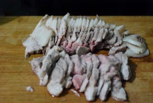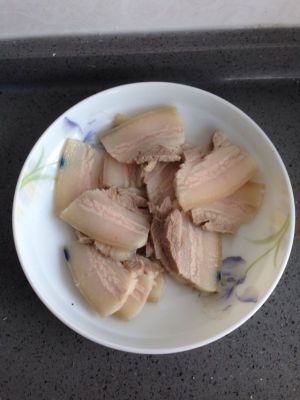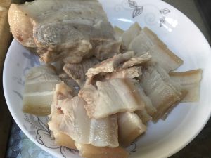 待猪肉稍凉一些,从水里捞出,可用厨房用纸吸干表面的水,或者甩一甩也可以,以免炒的时候爆得厉害。猪肉切薄片,尽量切薄。