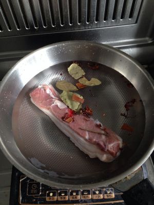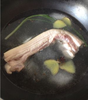 水里放盐、四片生姜片、1个八角茴香、1勺料酒、1根小葱煮沸,将洗净的五花肉放入,中小火煮25分左右。