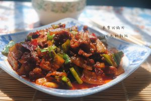 锅中放油,放花椒炸香,捞出花椒留底油,放入肉片、姜片,炒至肉片微焦微卷,放入郫县豆瓣酱、料酒、生抽、少许糖,炒片刻放入青红椒片、蒜片蒜苗断、胡萝卜片,炒断生出锅。