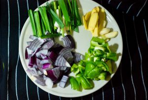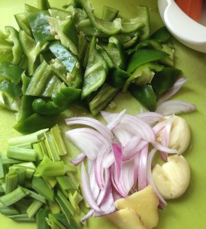 配料备好,姜蒜切片,青蒜切段,洋葱、青椒切块。
