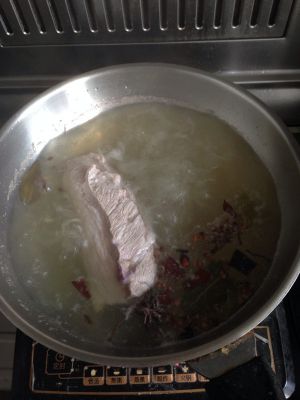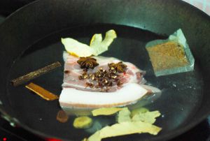 带皮猪肉冷水下锅,加入花椒、姜片、橘皮、桂皮、香叶、八角、卤料一包(可放可不放)。