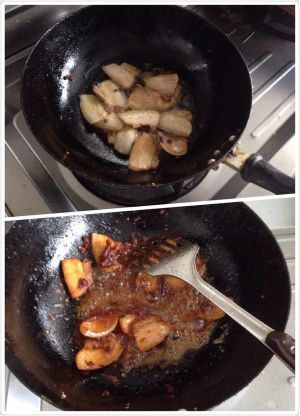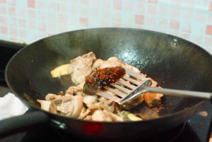 加入一勺豆瓣酱翻炒上色,这时可加点白酒、生抽、白糖调味。