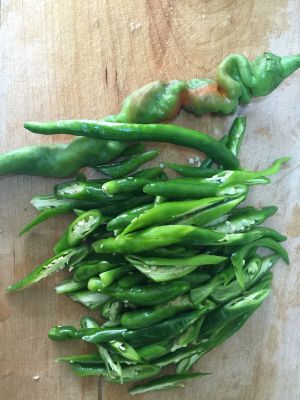 我用了两种辣椒,切丝。不能吃辣椒的人用普通的尖椒就行那个不太辣。