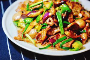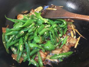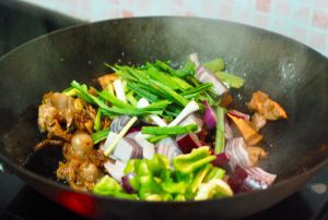 最后放青蒜、洋葱、青椒翻炒断生,加少许盐、鸡精调味。