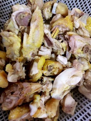 我买的是普通的肉鸡半只,肉鸡肉质鲜嫩。也可以选择鸡胸肉。鸡肉清洗干净,剁成小块。清水泡20分钟,去除血水。