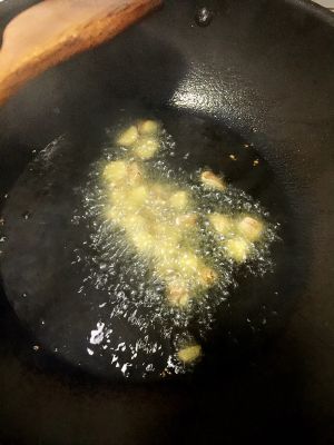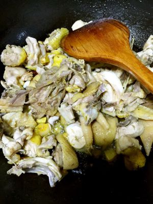 将鸡块爆出油,一定得出油。那样吃起来鸡肉才香…然后再装出来