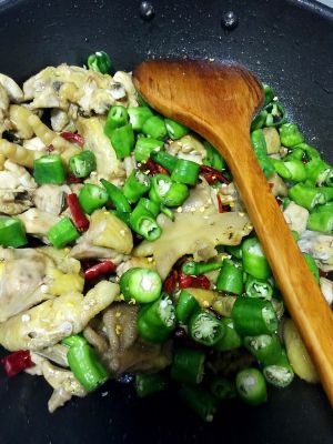 热锅冷油,油温五成热下鸡块儿,中小火把鸡块儿炸熟,八分熟的时候下杏鲍菇,一起炸熟,迅速捞出。