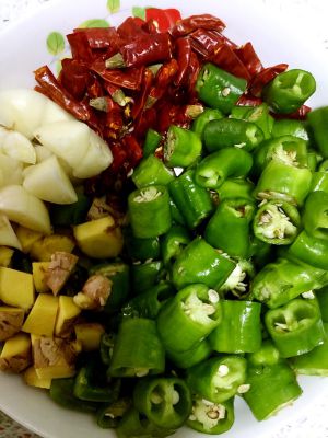 二荆条洗净 切成如图的圆筒 干辣椒 切段 生姜蒜 切成大颗粒 八角洗净 备用 大葱 切成和辣椒一样的圆筒