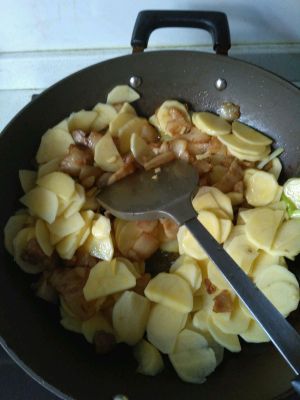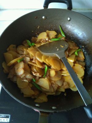 倒入土豆片一起翻炒,我还加了一点老干妈,不愧是百搭食品啊,加哪里都好吃~