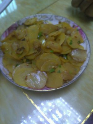 平底锅里热油,放土豆煎至金黄色,注意经常用筷子翻,土豆很容易粘