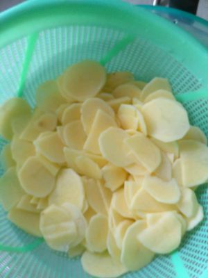 土豆切片,可以放在水里泡着,防止变色,也能去淀粉,比较不容易糊锅