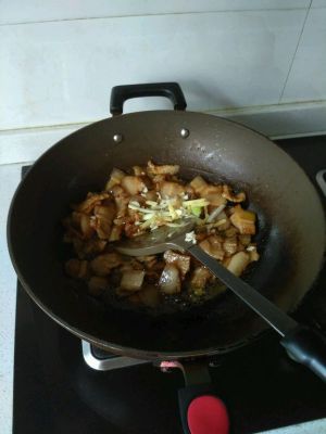 3.热锅下油(热锅凉油)。六成热,下五花肉爆炒