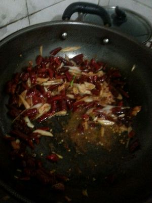 然后下鸡块 继续翻炒 撒盐和白芝麻 起锅 吃!天哪 好辣哦!(我这个干辣椒好辣)