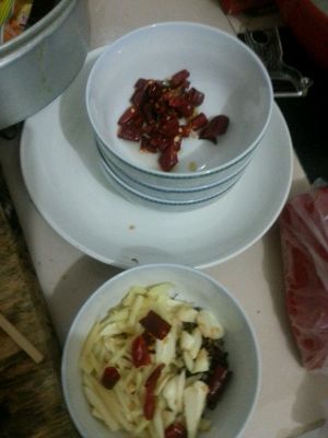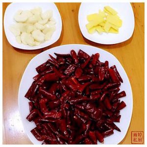 在腌制期间准备配料:干辣椒100克,整整一袋儿,哈哈哈,就是喜欢辣椒里挑肉的感觉,必须多放辣椒哈,辣椒剪成小段,一般辣椒中间剪断即可,长辣椒剪成3段,用手抓辣椒段去除辣椒籽,准备好辣椒段备用;大蒜一头,切去少许头尾端,从中间切开,蒜皮很好剥离开了,姜切片;葱切丝。
