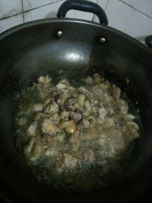 热锅凉油,大火。放姜葱爆香,把腌制好的鸡腿放在锅里煎至两面焦黄。放入老抽 蚝油 冰糖,醋。在下入土豆。翻炒均匀。