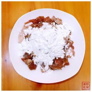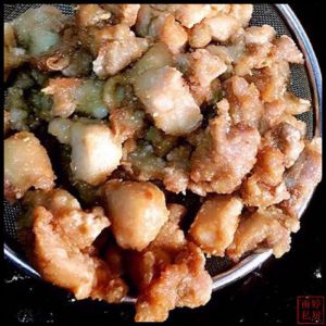腌制好的鸡肉块挑出葱段、姜块,在炸制前加2大勺生粉(红薯淀粉)裹匀。(当然也可以去省略裹生粉这一步,直接炸制,但个人认为这样炸制出的鸡肉更好吃,外酥里嫩,两种方法可以都尝试下,做出适合自己及家人口味的菜品)。