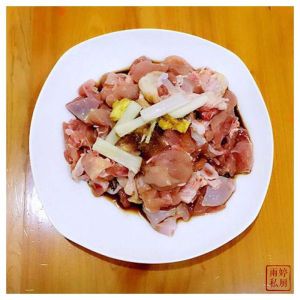 腌制鸡腿肉。放入淀粉。一点油。一点盐 葱段,姜片 料酒。抓匀。腌制20分钟