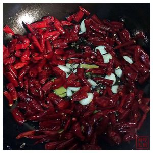 锅中留底油7一8分热,调中火加入蒜瓣、姜片爆香,加入花椒粒、辣椒段翻炒,(个人觉得两根木筷子是最好的翻炒工具,嘿嘿)待炒出香味,加入炸好的鸡肉块继续翻炒1一2分钟,撒入熟芝麻,葱丝炒匀,关火,出锅。