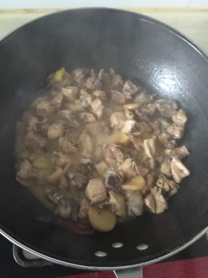葱姜蒜段下锅'爆出香味'鸡肉下锅'加入料酒'翻炒'加清水'一勺盐'盖盖儿顿制汤汁收干