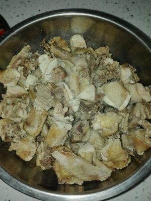 将入味的鸡块放入开水中焯水,水一翻滚马上捞出,将之前所有调料如葱,蒜等全部去掉,只留鸡块。