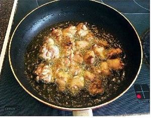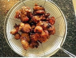 用大火烧开油,放入鸡丁来炸至金黄捞出。